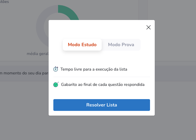 Existem duas formas de resolver as questões pertencentes às listas de exercícios: modo estudo ou modo prova.