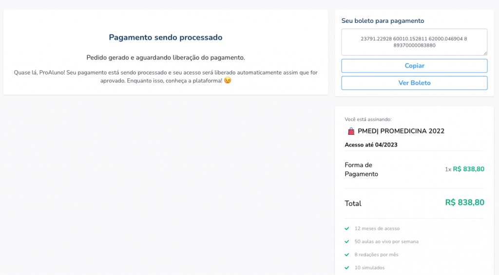 Pagamentos realizados via cartão de crédito e via PIX à vista são identificados imediatamente na hora da compra com a assinatura. Compras feitas via boleto bancário à vista têm um prazo de até três dias úteis após pagamento, para liberação do plano na plataforma. No entanto, compras por boleto bancário geralmente, são identificadas em até 24 horas úteis após o pagamento. Caso tenha passado o prazo estimado para a compensação do boleto, e sua conta ainda não tenha sido ativada, peço que entre em contato com nossa equipe através do WhatsApp link: https://bit.ly/CentralAjudaPromedicina para verificação.