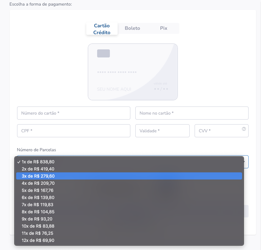 Caso você confunda e selecione a opção boleto bancário ao invés de cartão de crédito, não precisa se preocupar. Basta desconsiderar o boleto (não pagá-lo) e refazer o procedimento de compra logado na plataforma. Porem dessa vez selecionando a opção de cartão de crédito. Lembre-se que só assim você poderá parcelar a compra.